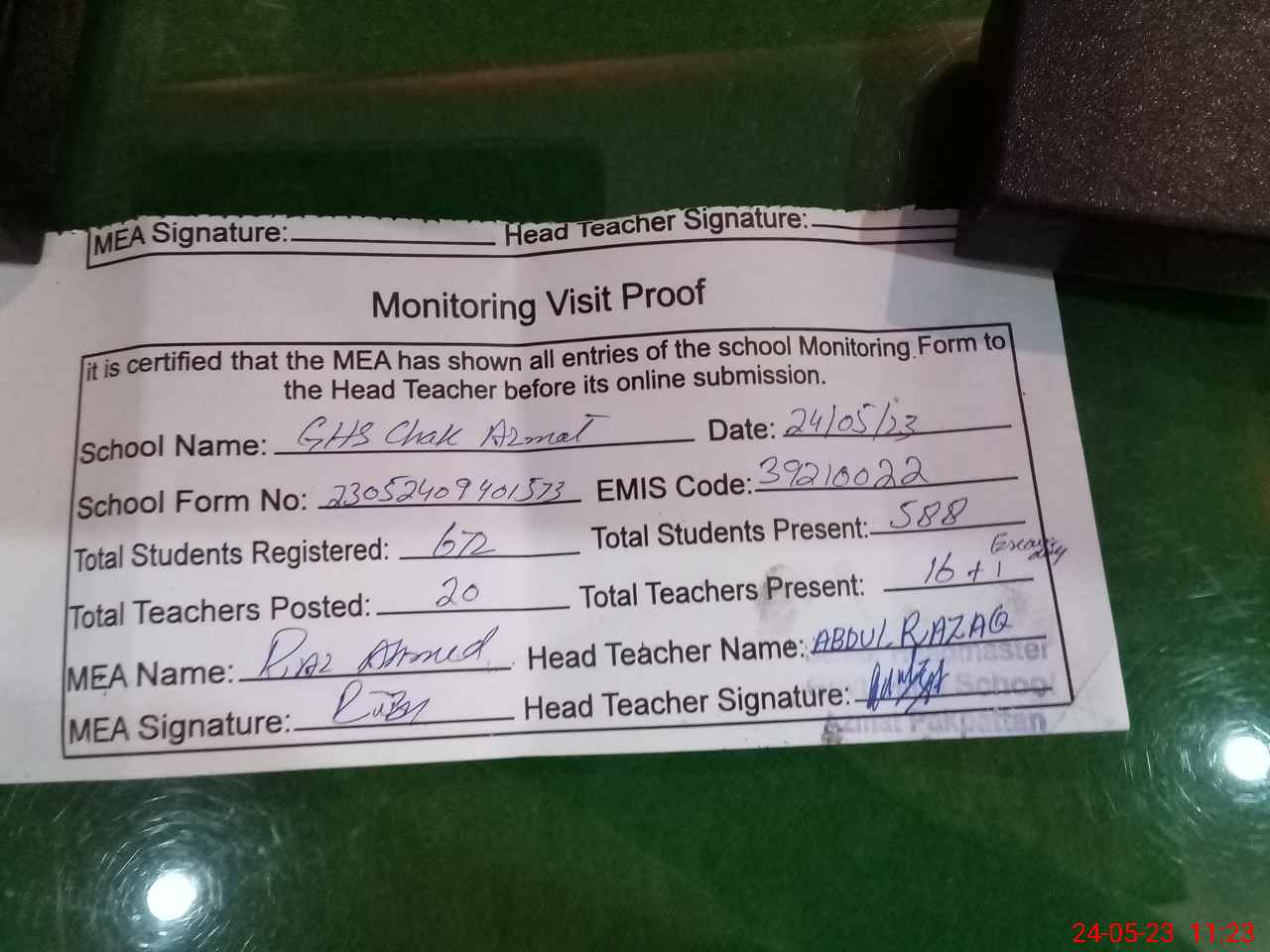 | EMIS Code: 39210022 | Name of School: GHS CHAK AZMAT | |||