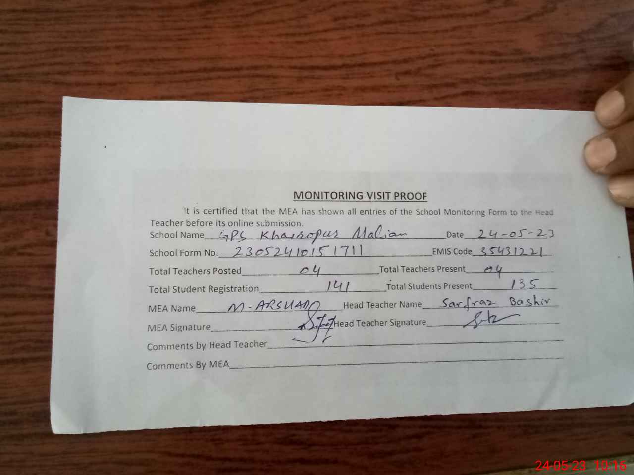 | Attendance Register | Head Teacher | MEA with School | Visit Proof |