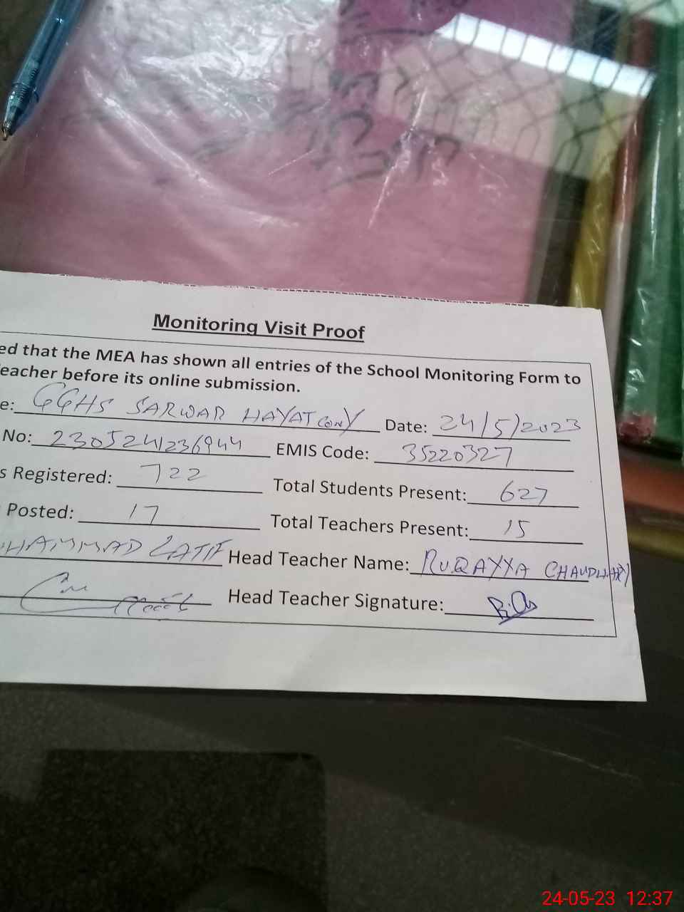 | Attendance Register | Head Teacher | MEA with School | Visit Proof |