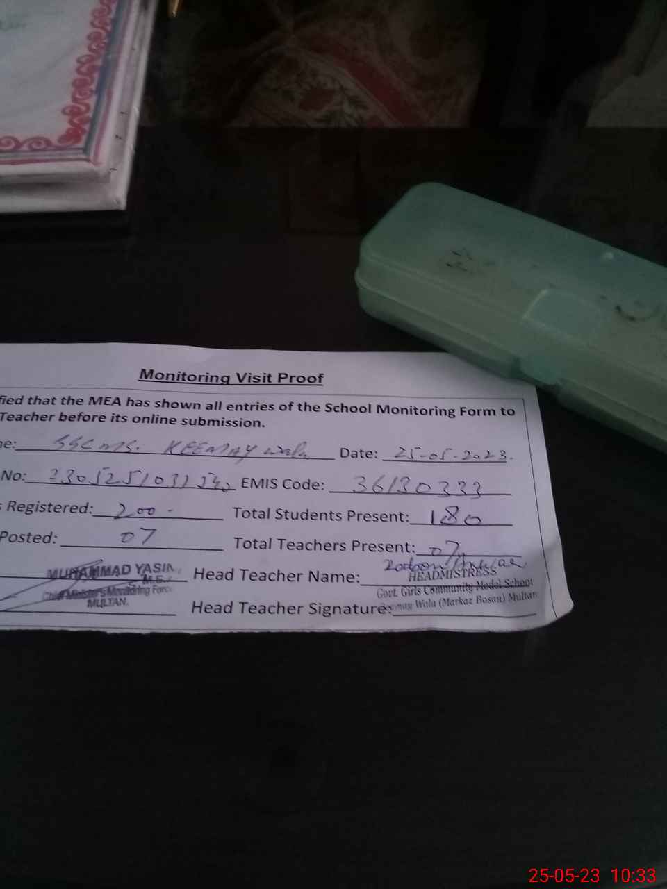 | Attendance Register | Head Teacher | MEA with School | Visit Proof |