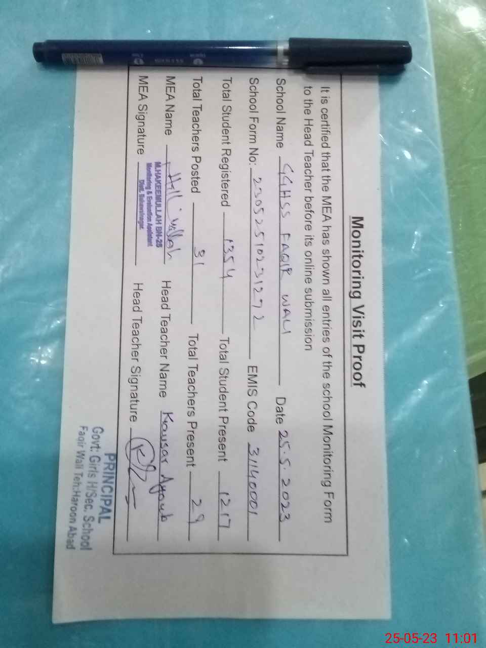 | Attendance Register | Head Teacher | MEA with School | Visit Proof |