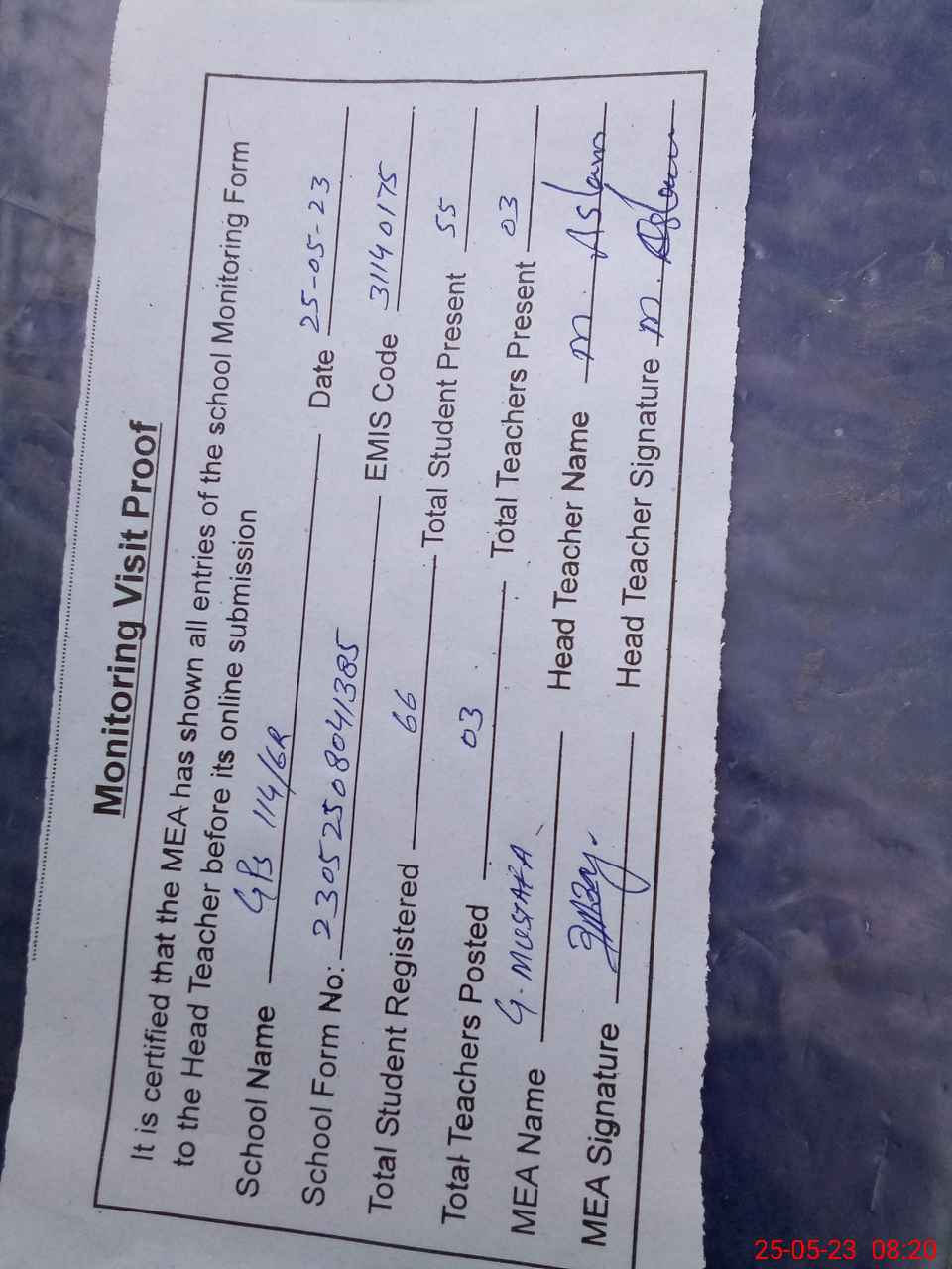 | Attendance Register | Head Teacher | MEA with School | Visit Proof |
