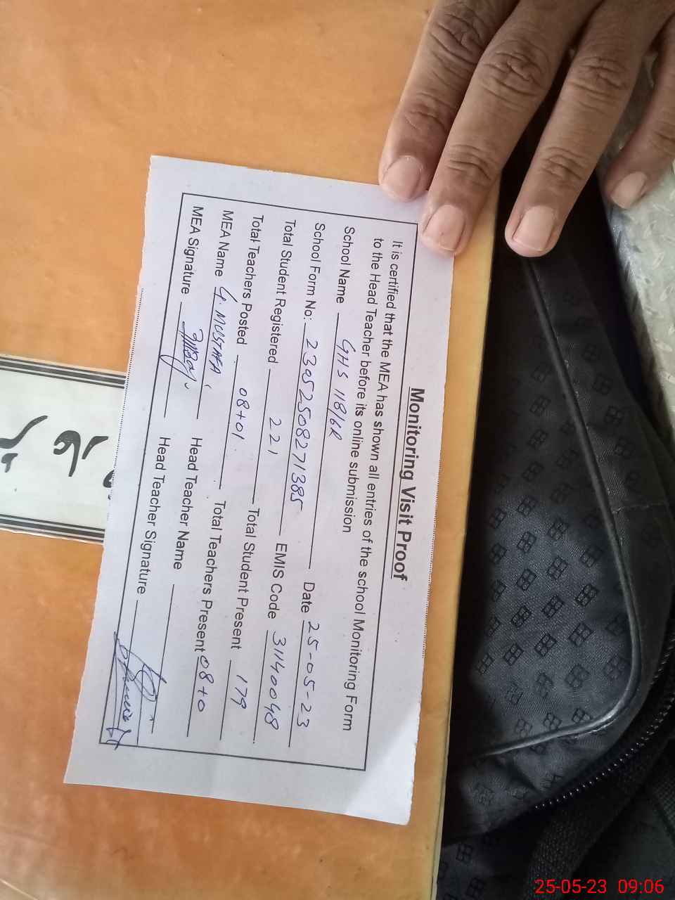 | Attendance Register | Head Teacher | MEA with School | Visit Proof |