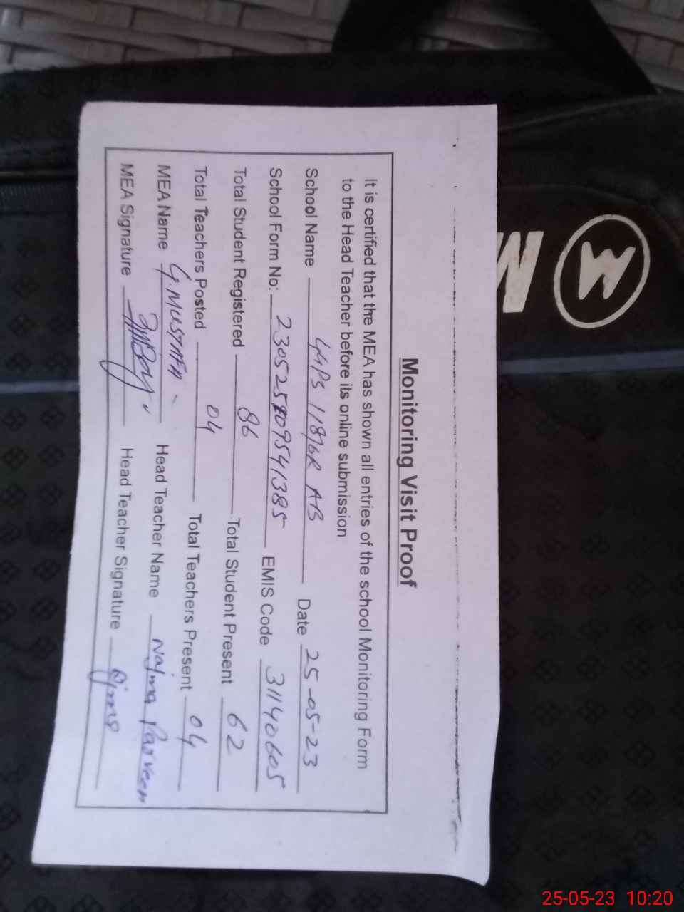 | Attendance Register | Head Teacher | MEA with School | Visit Proof |