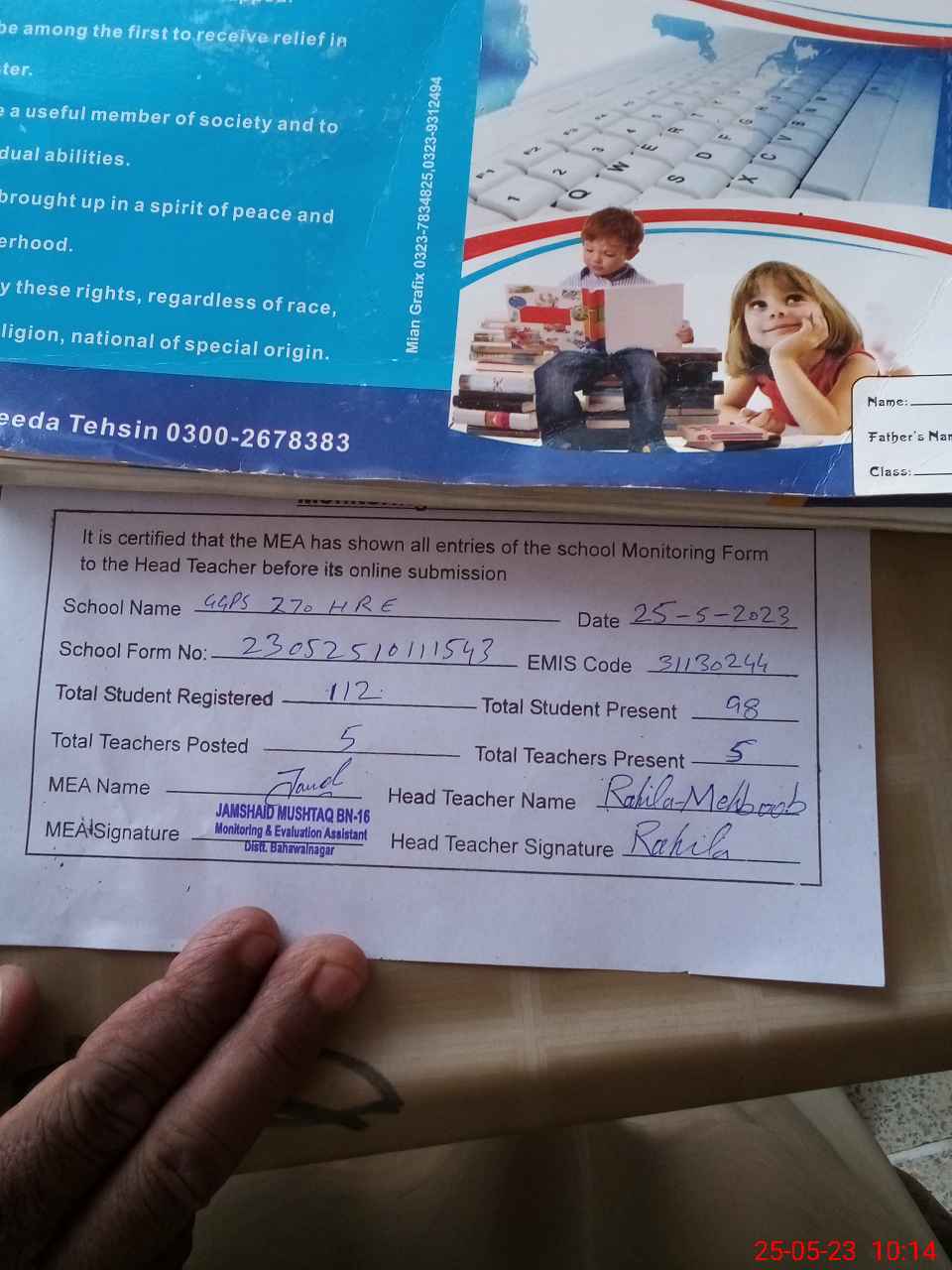 | Name: AB**** Na**** Designation: (School Headmaster's/Headmistress's) PST Phone/Cell Number: 03**** |