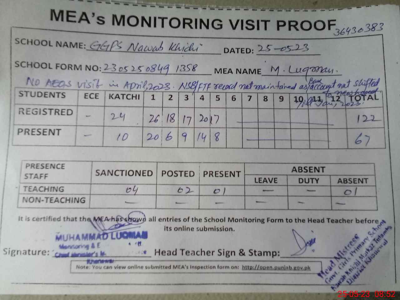 | Attendance Register | Head Teacher | MEA with School | Visit Proof |