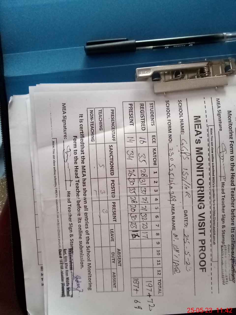 | Attendance Register | Head Teacher | MEA with School | Visit Proof |