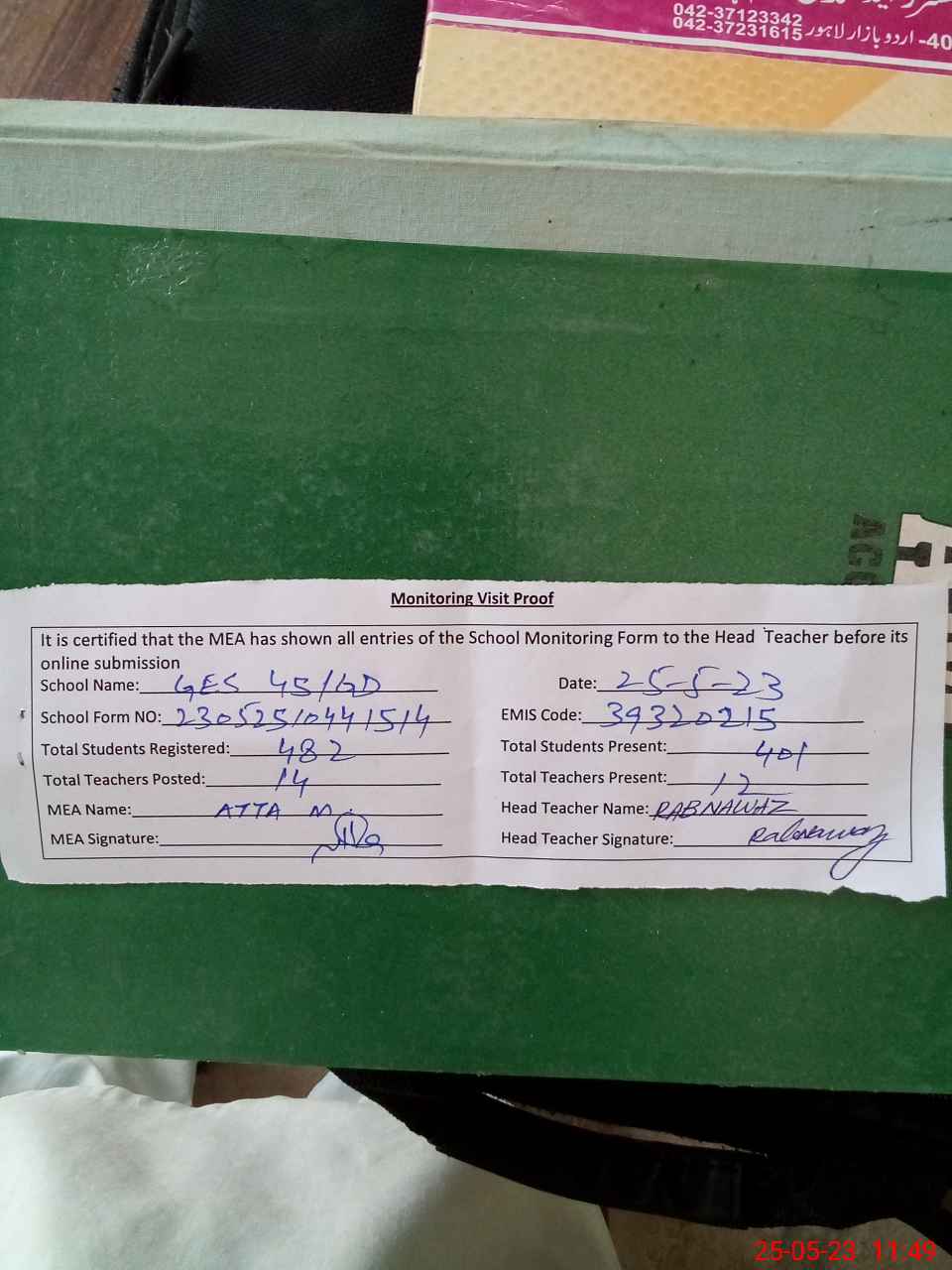 | EMIS Code: 39320215 | Name of School: GHS CHAK 45/G.D | |||