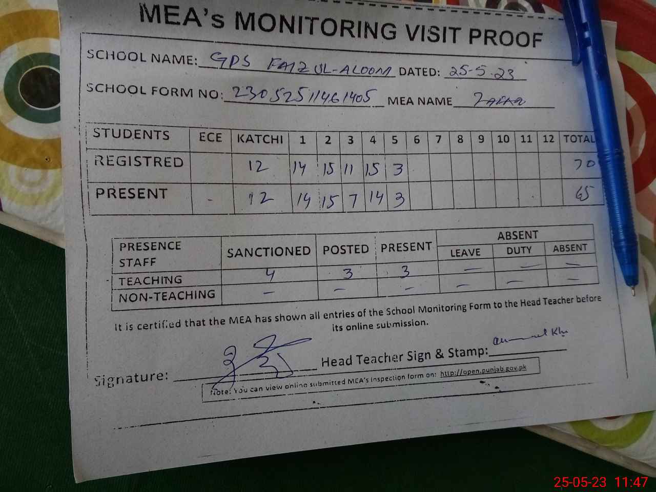 | Attendance Register | Head Teacher | MEA with School | Visit Proof |