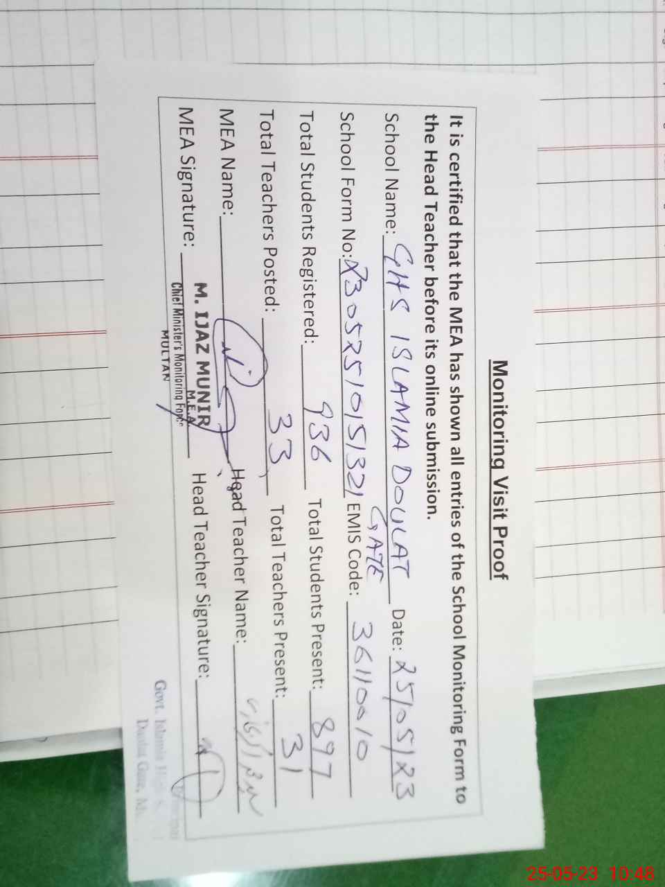 | EMIS Code: 36110010 | Name of School: GHS ISLAMIA DAULAT GATE MULTAN | |||