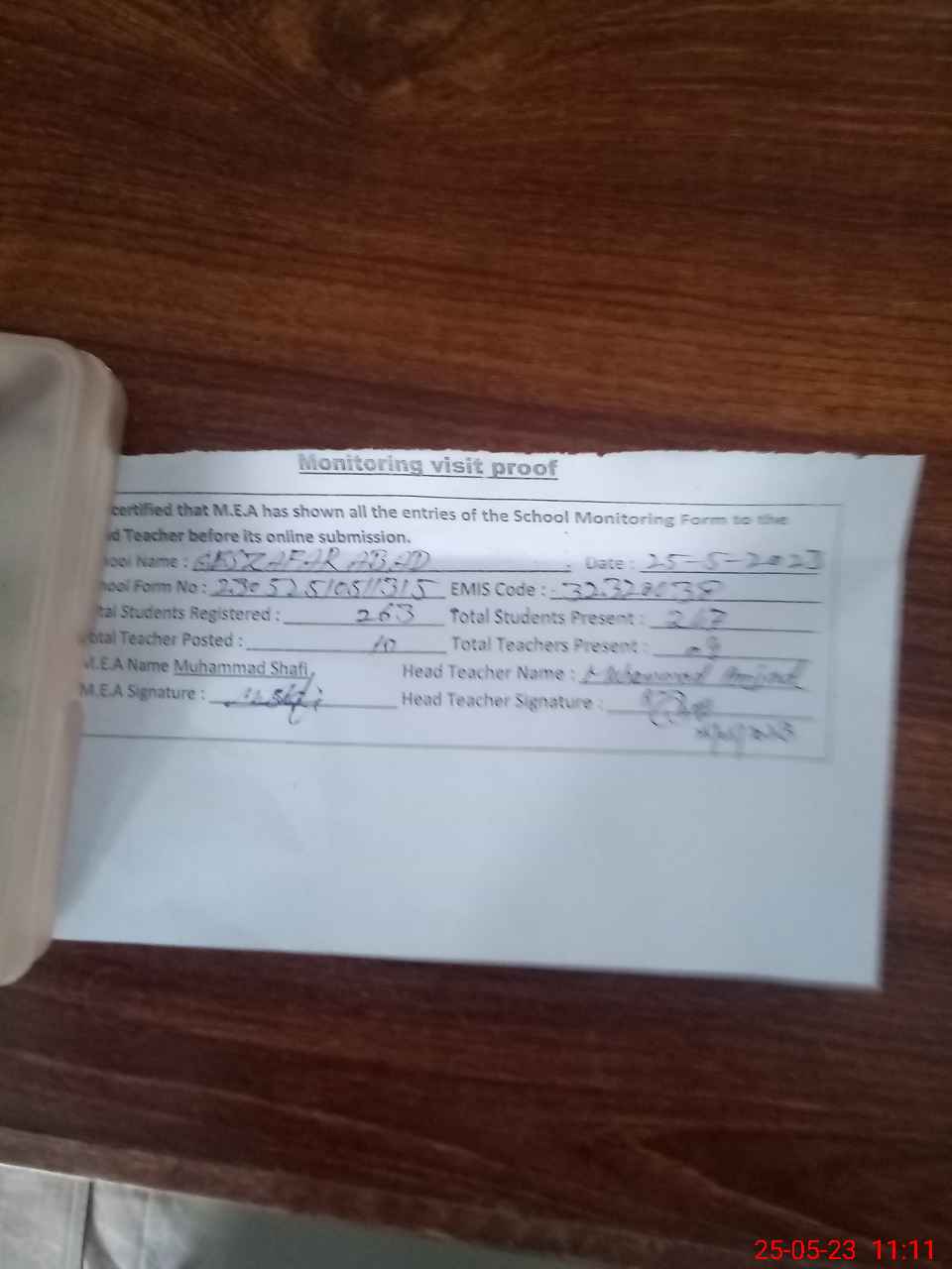 | Attendance Register | Head Teacher | MEA with School | Visit Proof |