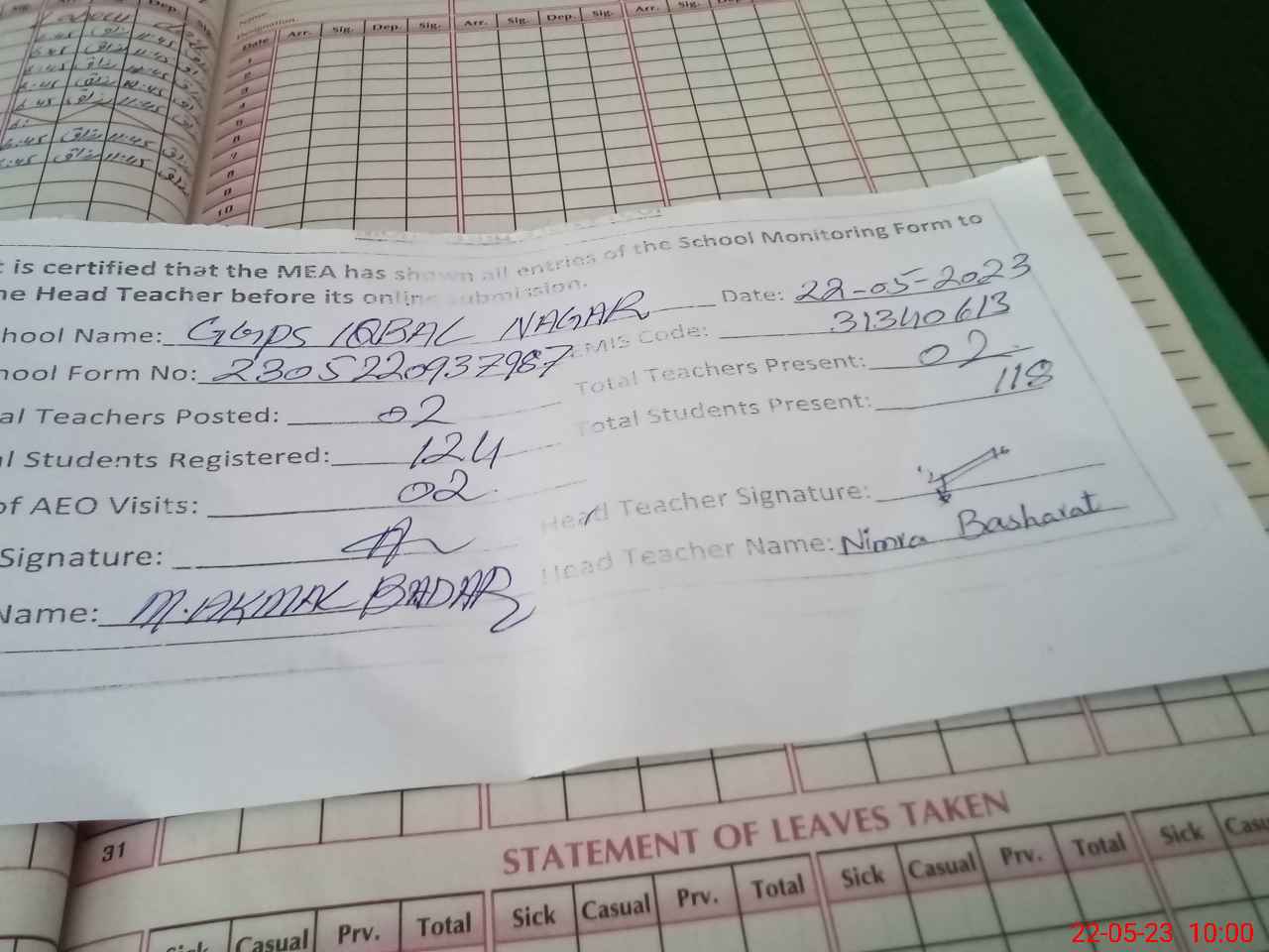 | Attendance Register | Head Teacher | MEA with School | Visit Proof |