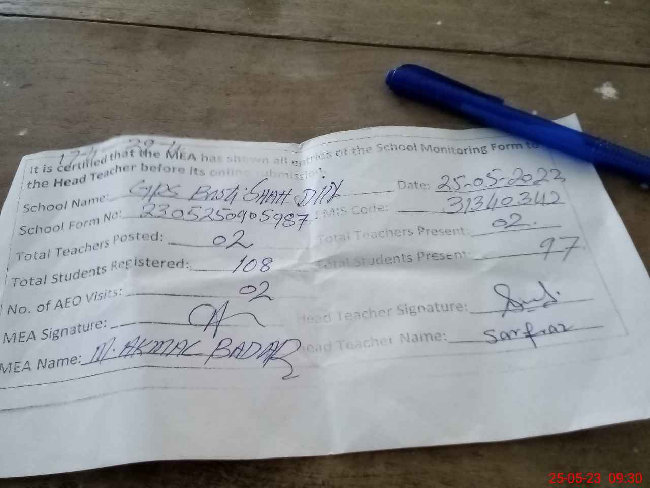 | Attendance Register | Head Teacher | MEA with School | Visit Proof |
