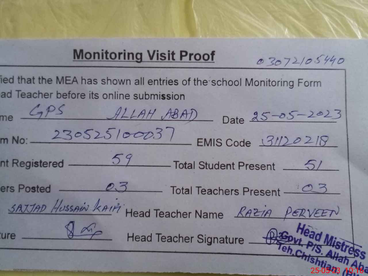 | Attendance Register | Head Teacher | MEA with School | Visit Proof |