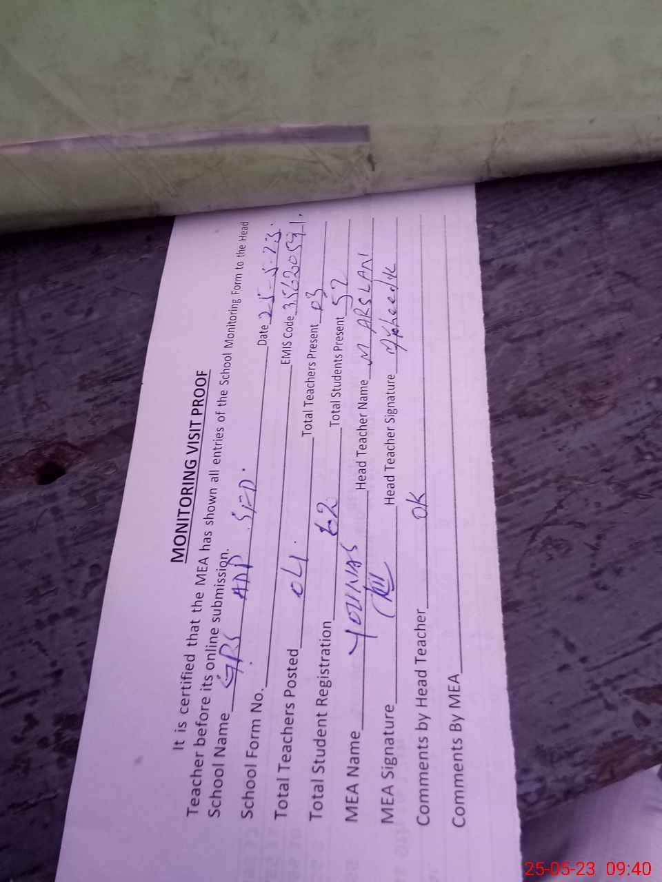 | Attendance Register | Head Teacher | MEA with School | Visit Proof |