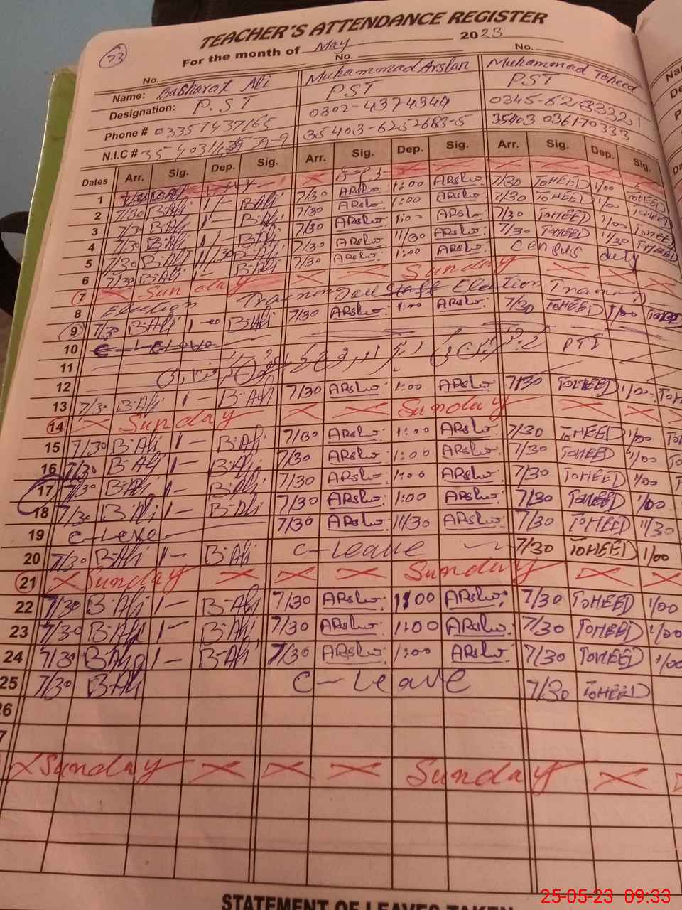 | CNIC | Full Name | Designation | R/C | Absence during last cal. month |