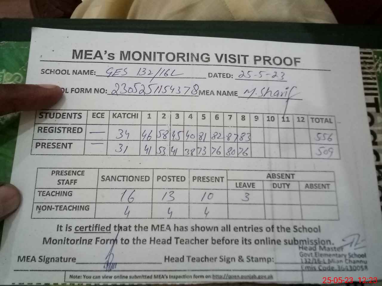 | Attendance Register | Head Teacher | MEA with School | Visit Proof |