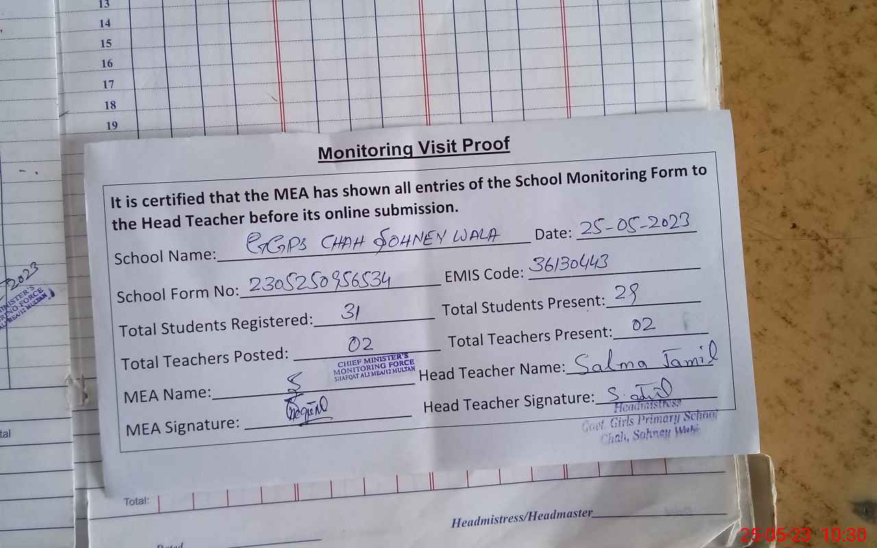 | Attendance Register | Head Teacher | MEA with School | Visit Proof |