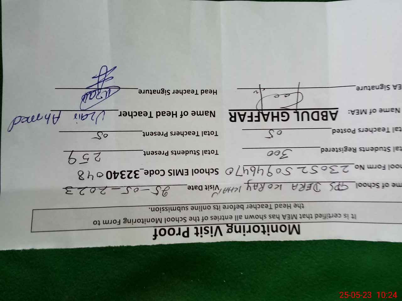 | Certified that this School was Inspected by the Undersigned MEA/DMO Today and the Information Stated Above is as Per Record. | |||||