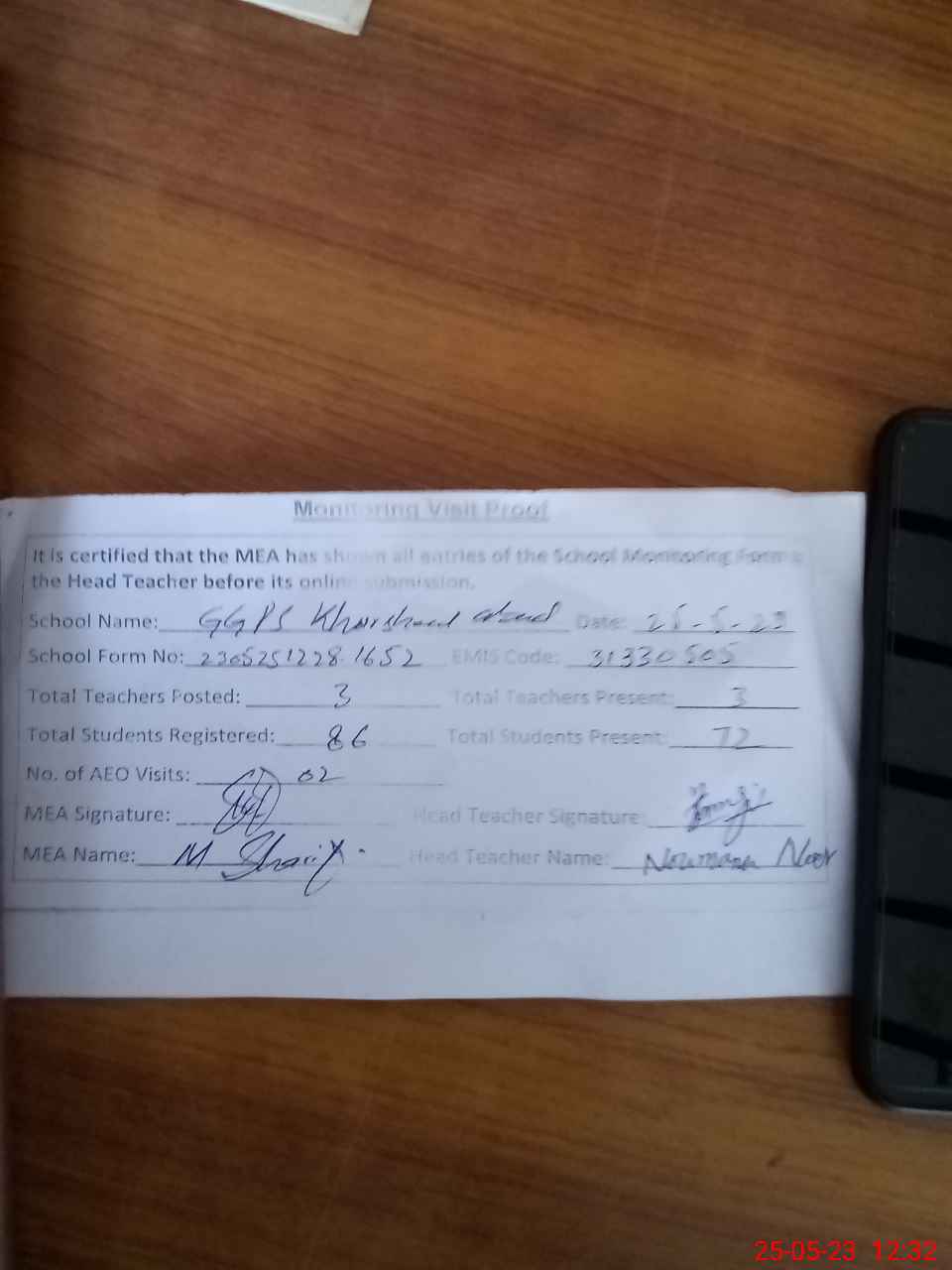 | Attendance Register | Head Teacher | MEA with School | Visit Proof |