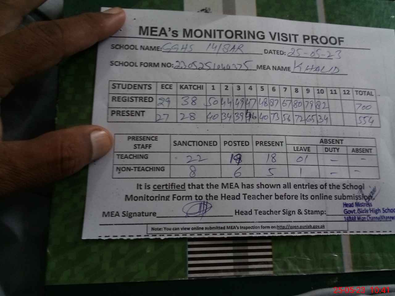 | Attendance Register | Head Teacher | MEA with School | Visit Proof |