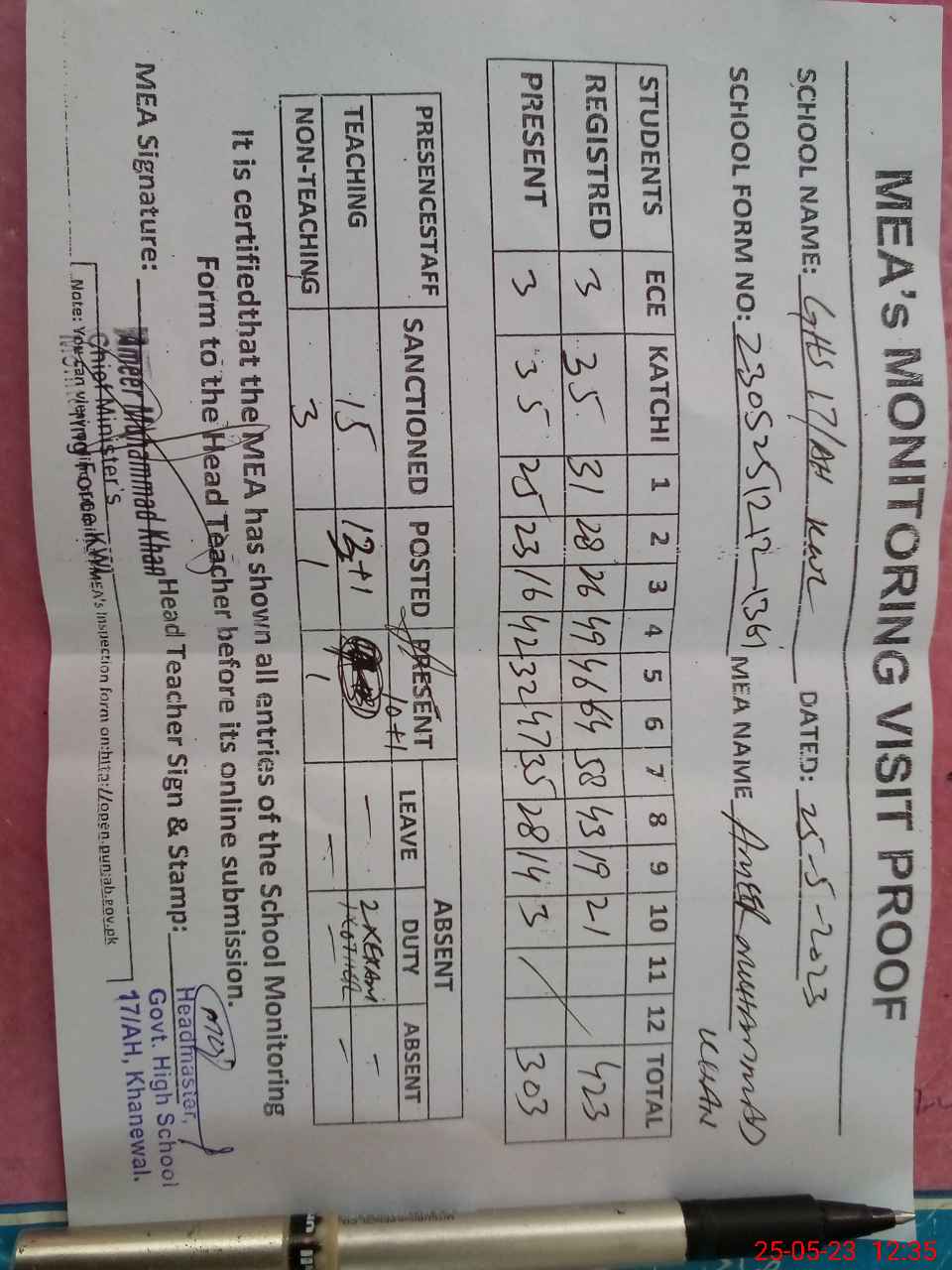| Attendance Register | Head Teacher | MEA with School | Visit Proof |