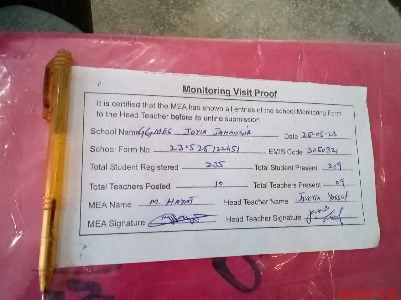 | Attendance Register | Head Teacher | MEA with School | Visit Proof |