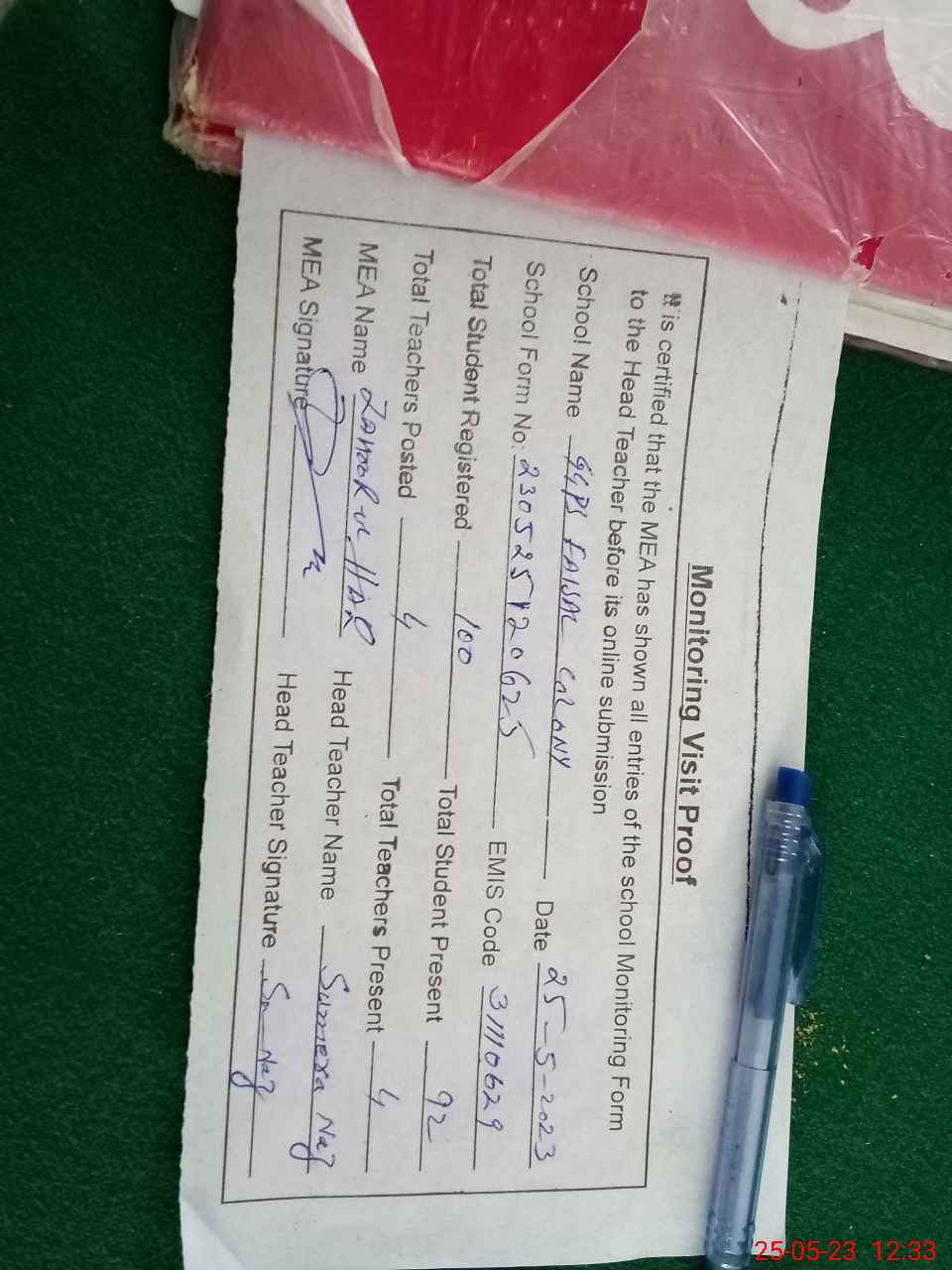 | Attendance Register | Head Teacher | MEA with School | Visit Proof |