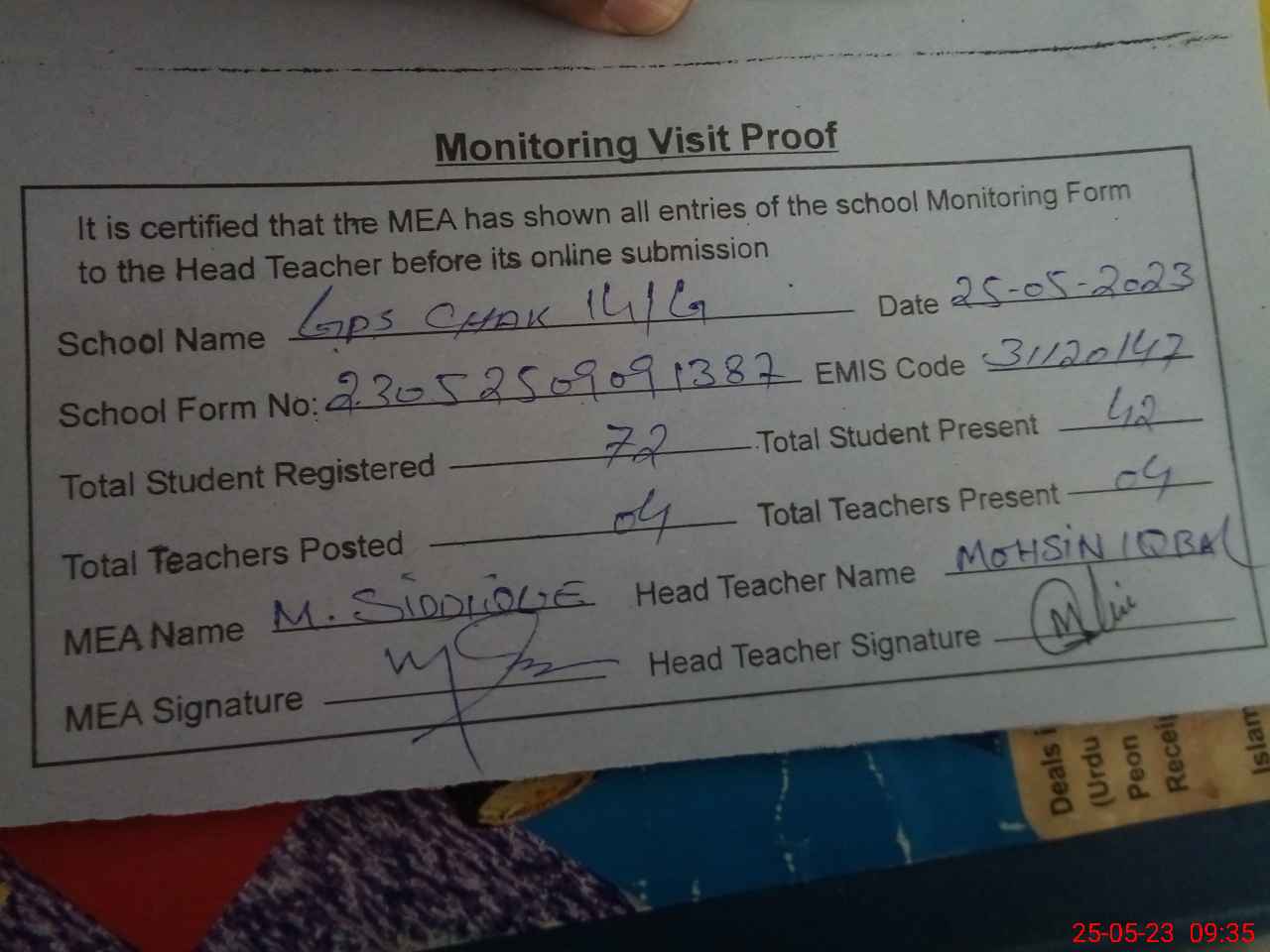 | EMIS Code: 31120147 | Name of School: GPS CHAK 14 GAJIANI | |||
