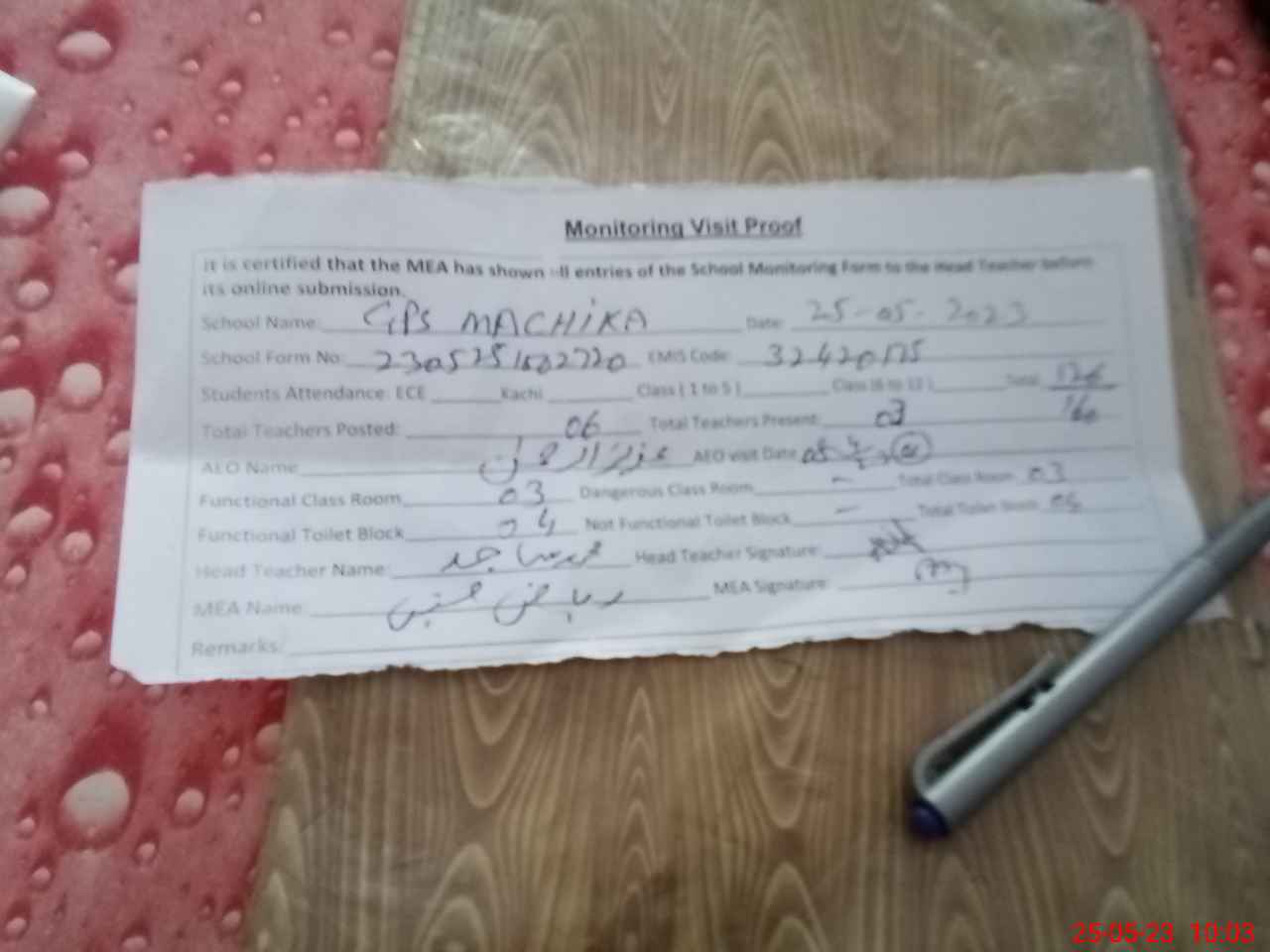 | Attendance Register | Head Teacher | MEA with School | Visit Proof |