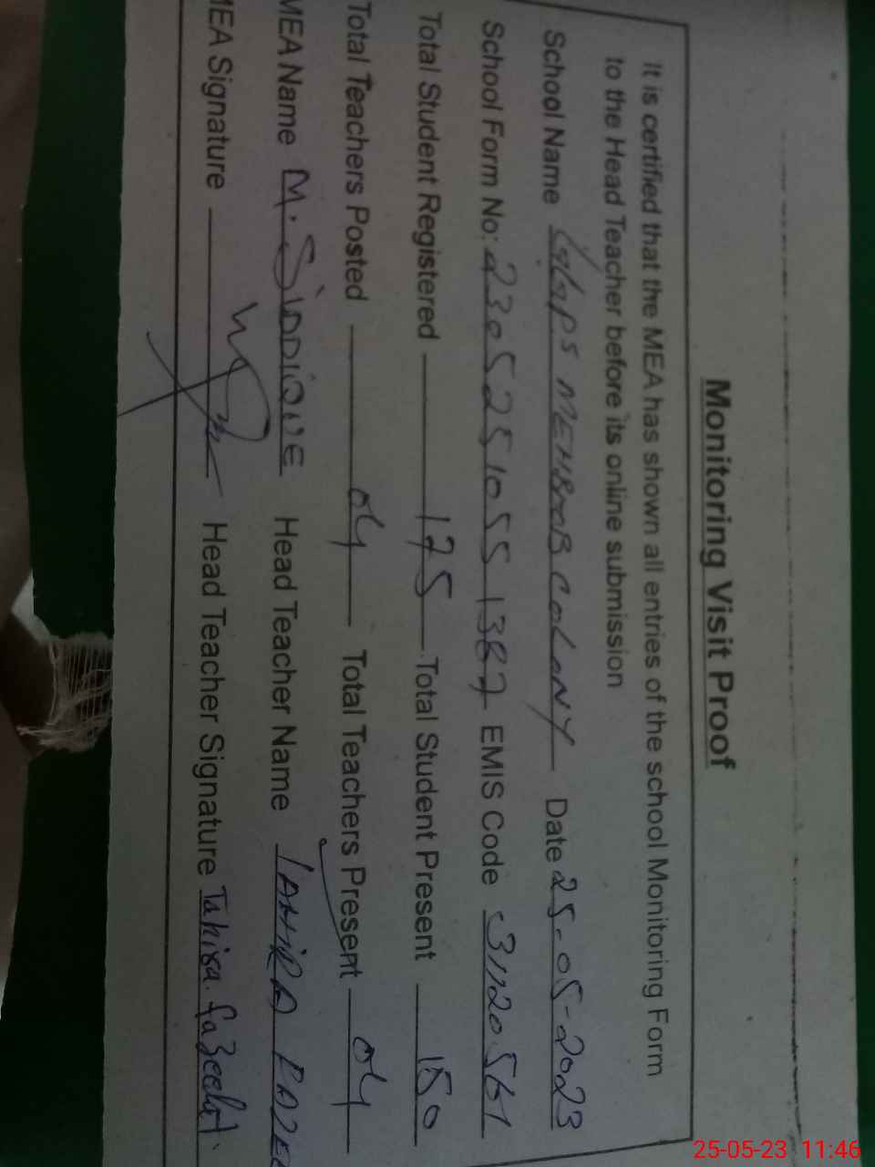 | Attendance Register | Head Teacher | MEA with School | Visit Proof |