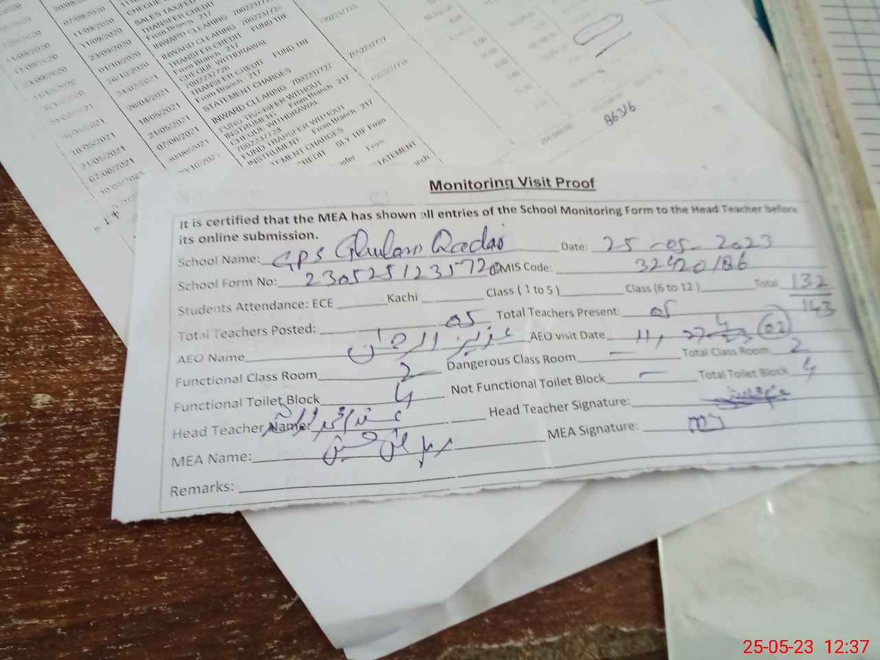 | Attendance Register | Head Teacher | MEA with School | Visit Proof |
