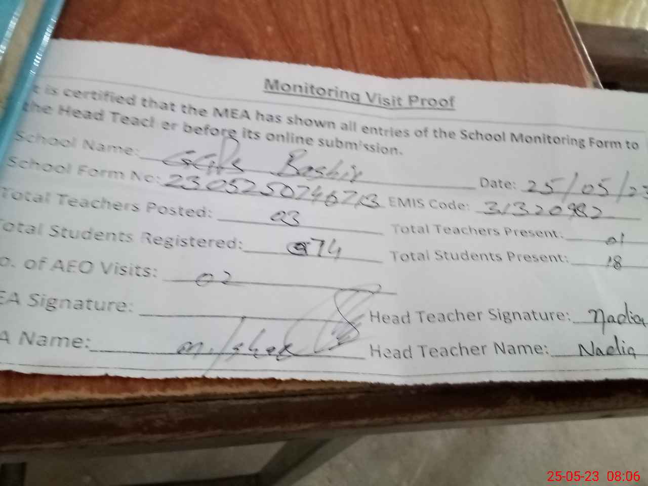 | Attendance Register | Head Teacher | MEA with School | Visit Proof |