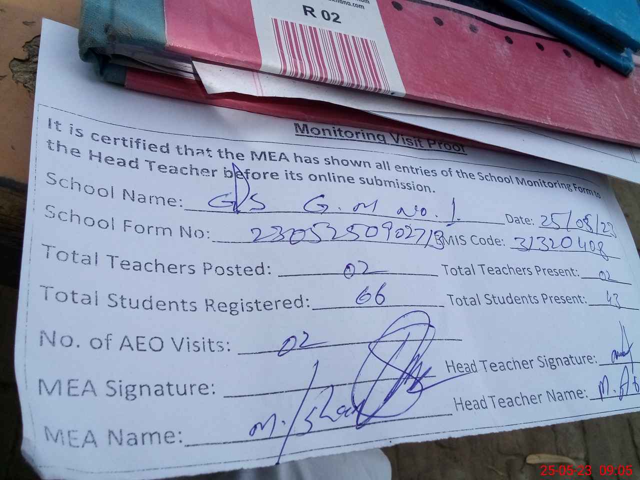 | Attendance Register | Head Teacher | MEA with School | Visit Proof |