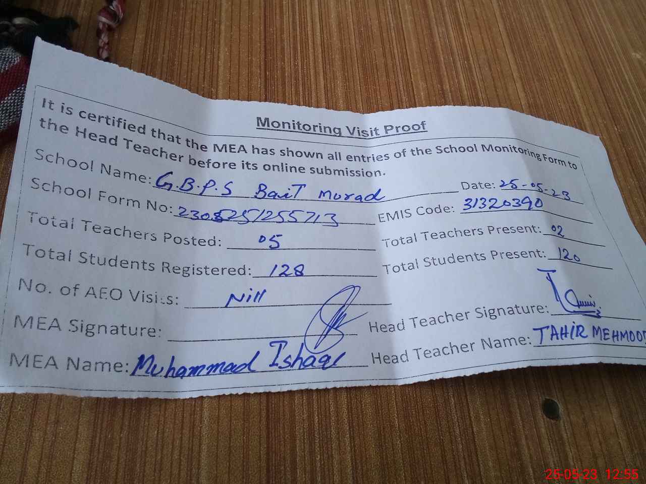 | Attendance Register | Head Teacher | MEA with School | Visit Proof |