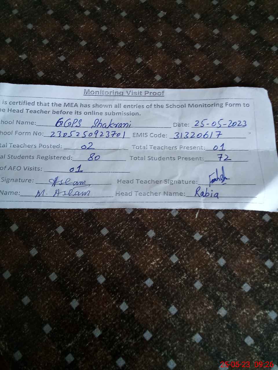 | Attendance Register | Head Teacher | MEA with School | Visit Proof |