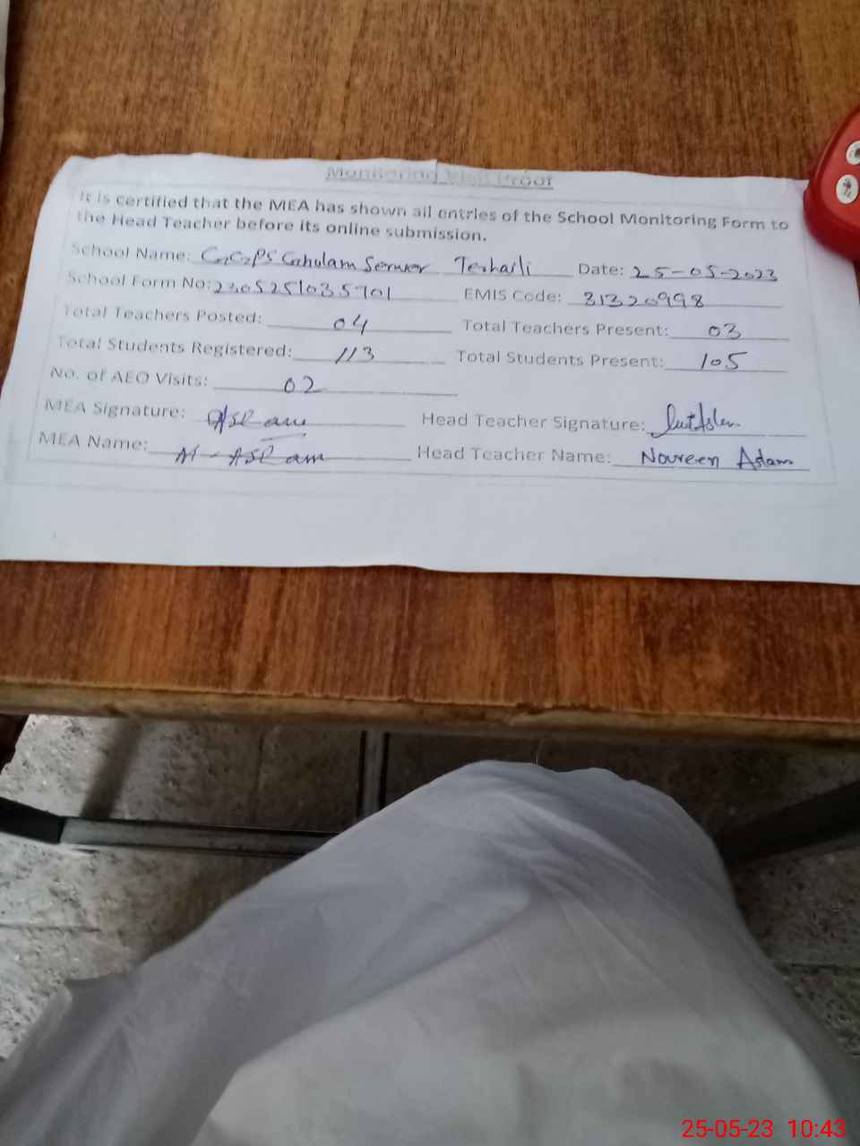 | Attendance Register | Head Teacher | MEA with School | Visit Proof |