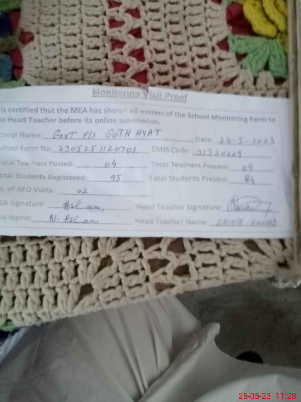 | Attendance Register | Head Teacher | MEA with School | Visit Proof |