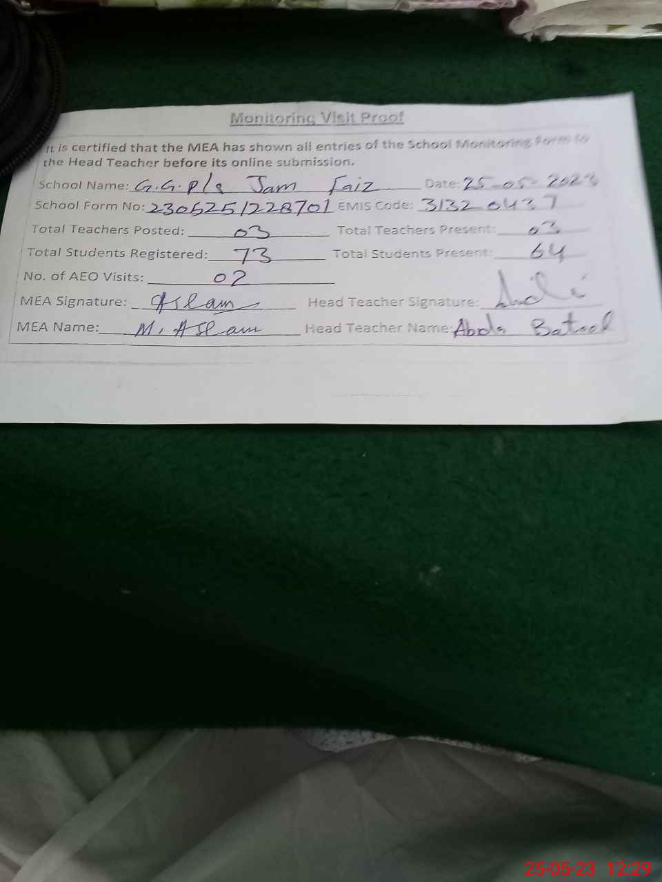 | Attendance Register | Head Teacher | MEA with School | Visit Proof |
