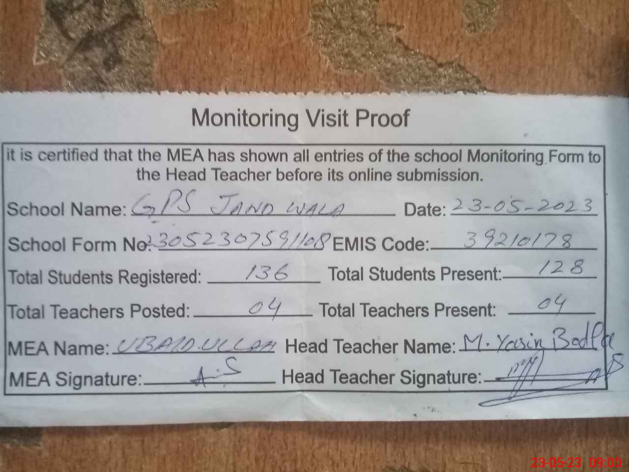 | Attendance Register | Head Teacher | MEA with School | Visit Proof |
