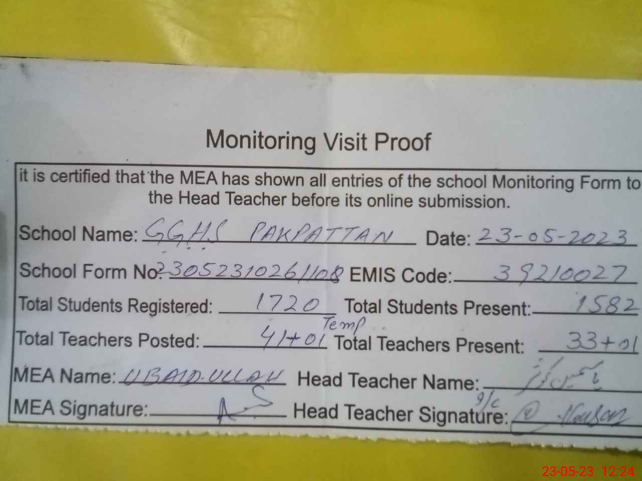 | Attendance Register | Head Teacher | MEA with School | Visit Proof |