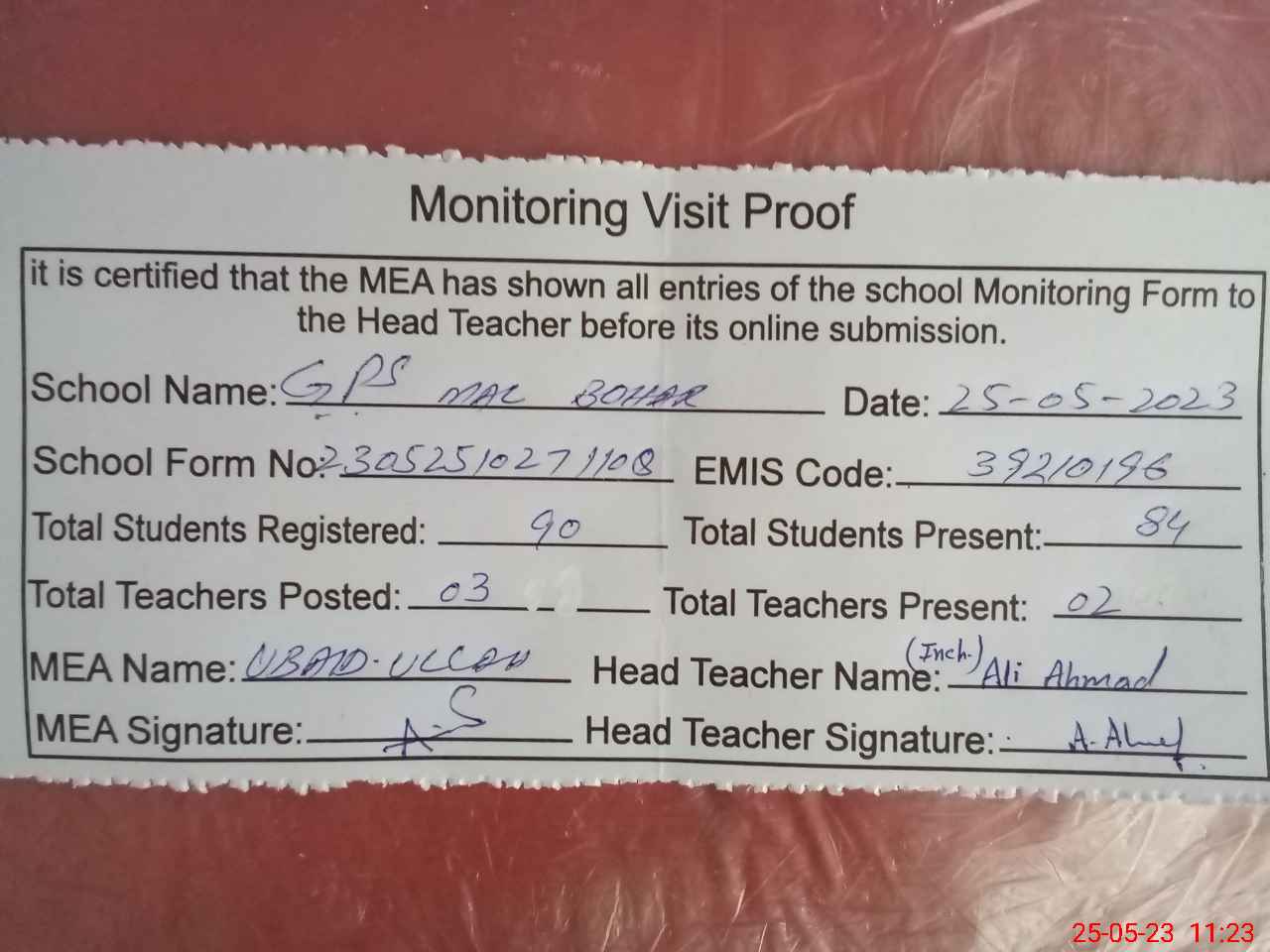 | Attendance Register | Head Teacher | MEA with School | Visit Proof |