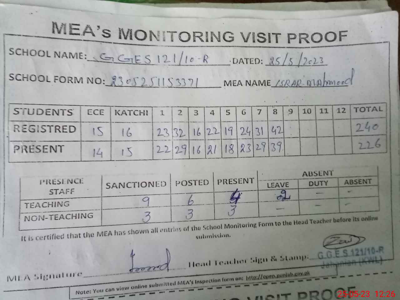 | Attendance Register | Head Teacher | MEA with School | Visit Proof |