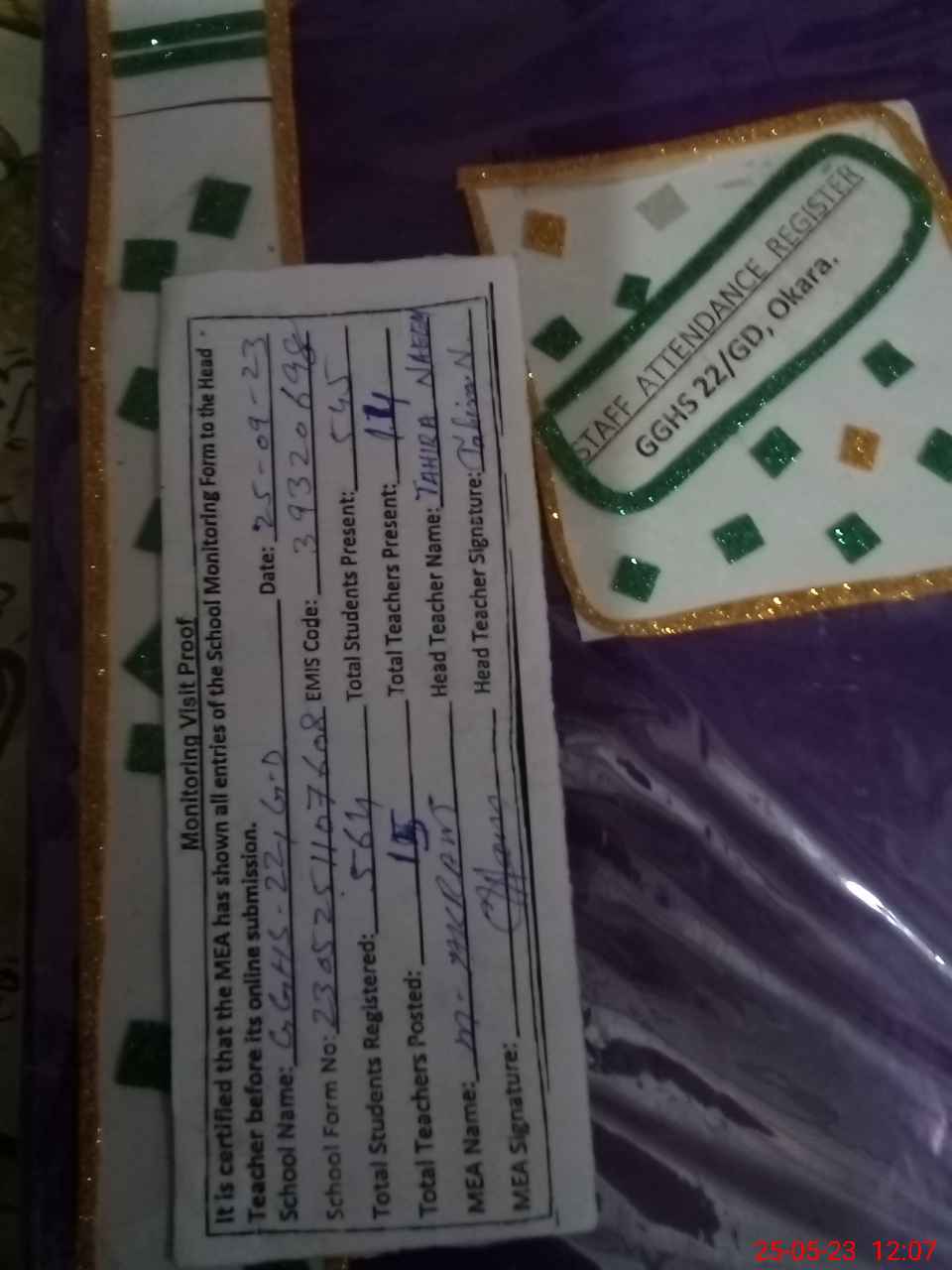 | Attendance Register | Head Teacher | MEA with School | Visit Proof |
