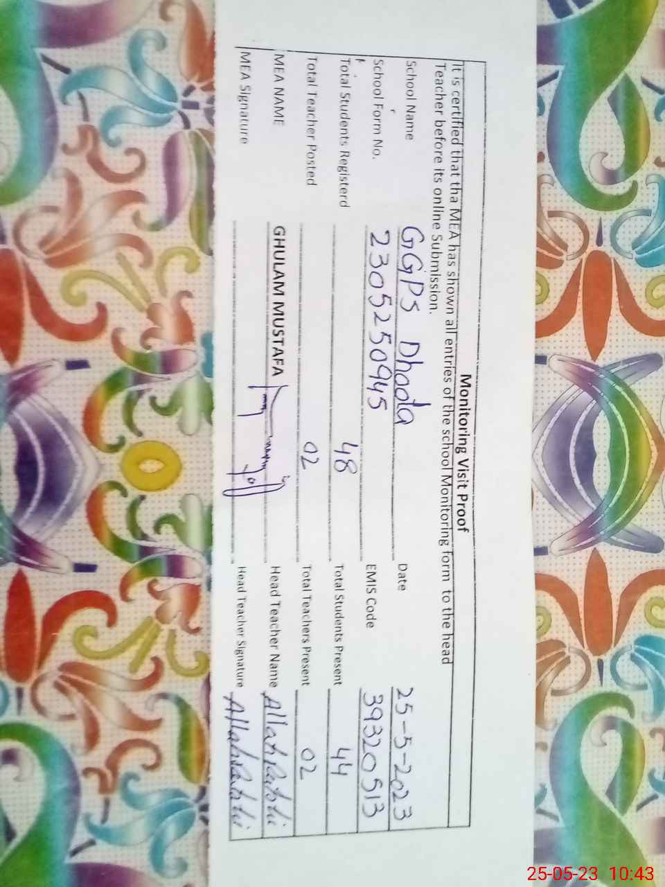 | Certified that this School was Inspected by the Undersigned MEA/DMO Today and the Information Stated Above is as Per Record. | |||||