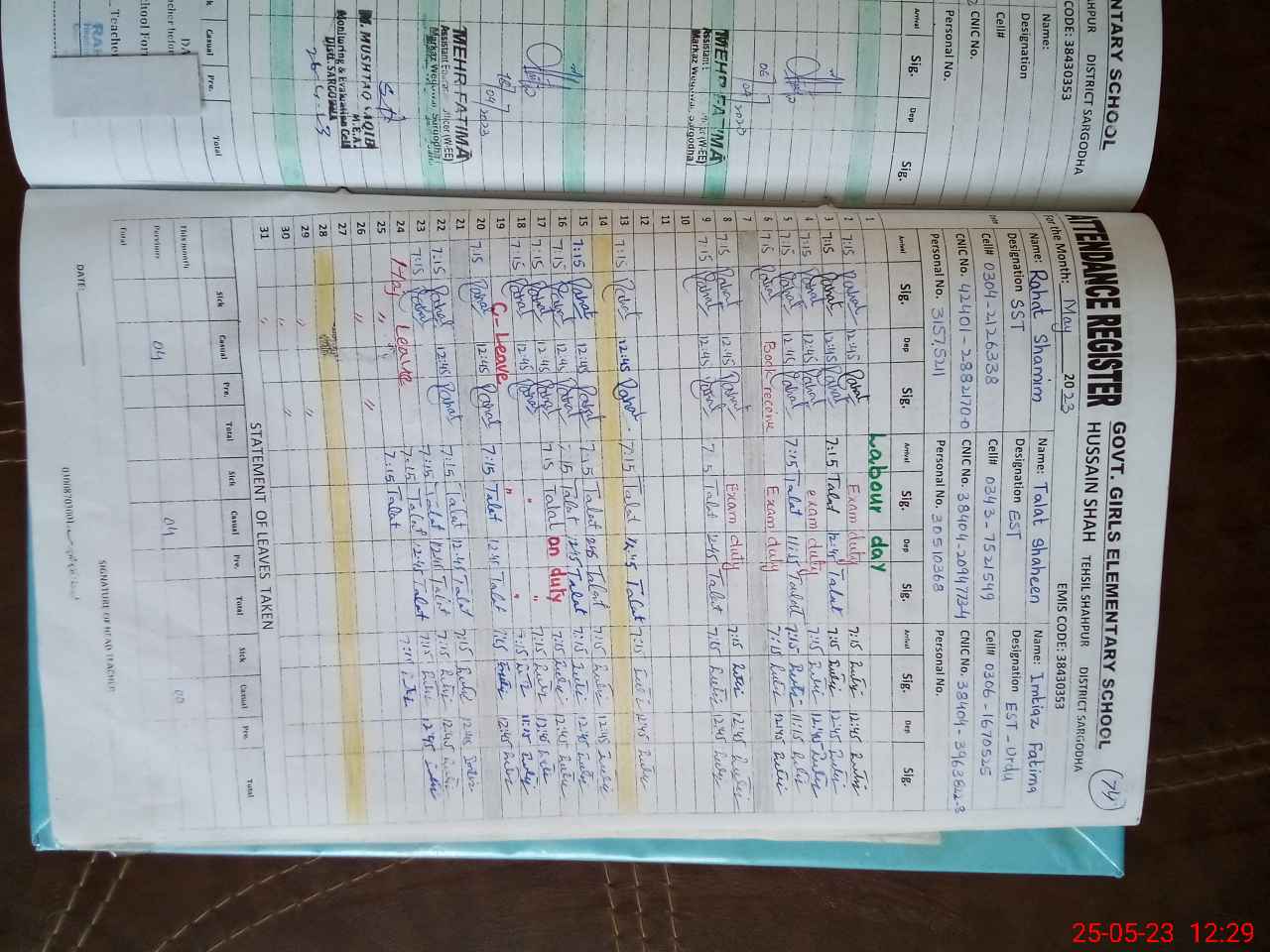 | CNIC | Full Name | Designation | R/C | Absence During Last Calender Month |