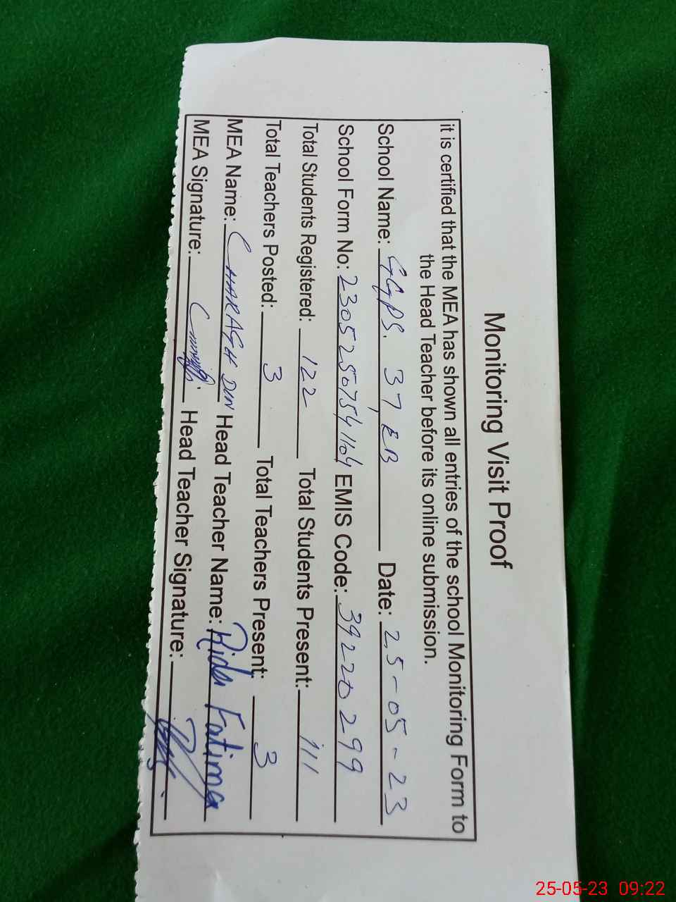 | Attendance Register | Head Teacher | MEA with School | Visit Proof |