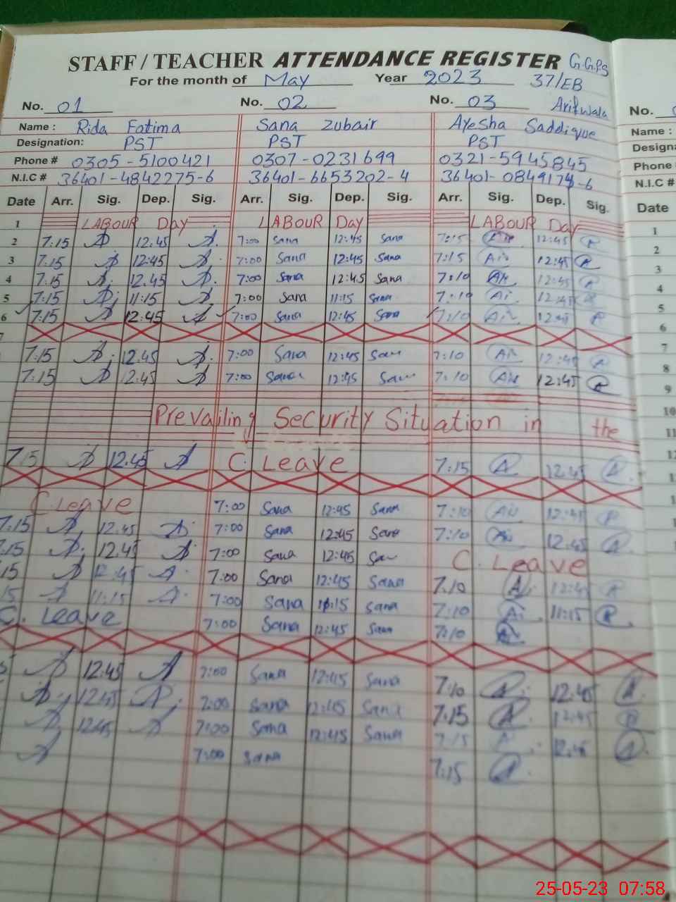 | CNIC | Full Name | Designation | R/C | Absence During Last Calender Month |