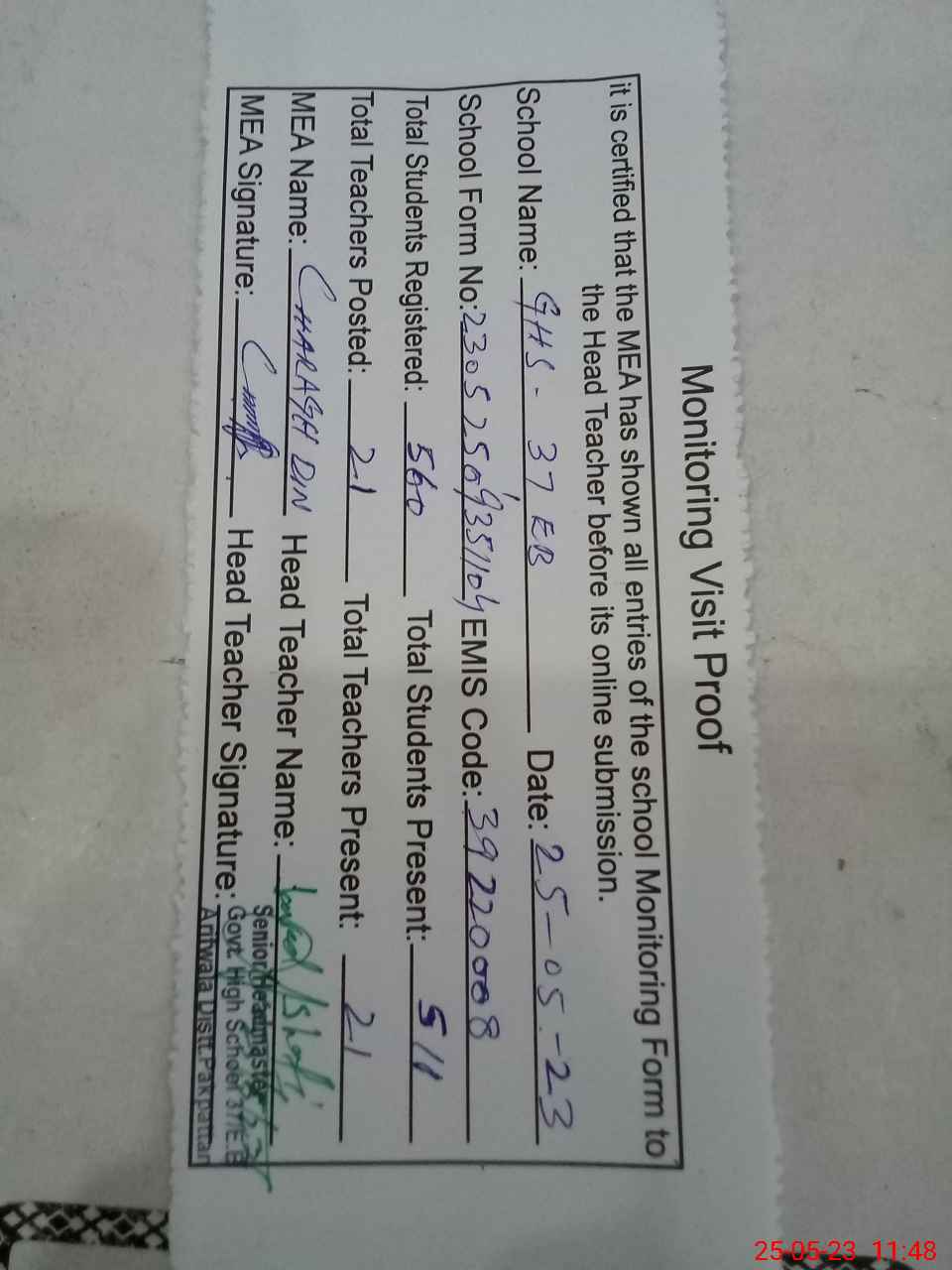 | Attendance Register | Head Teacher | MEA with School | Visit Proof |