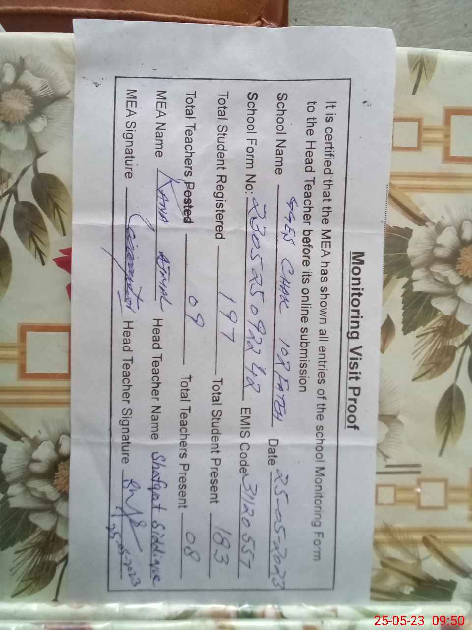 | Attendance Register | Head Teacher | MEA with School | Visit Proof |